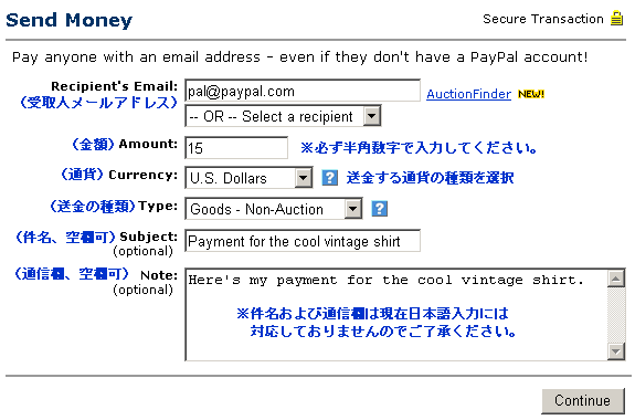 (注:カード確認番号に問題がある場合などには、PayPal利用拡張プログラム(Expanded Use Program) に加入申し込みいただき、利用拡張番号(Expanded Use Number)を入力後、 認証されるまでご送金いただけないことがあります。)